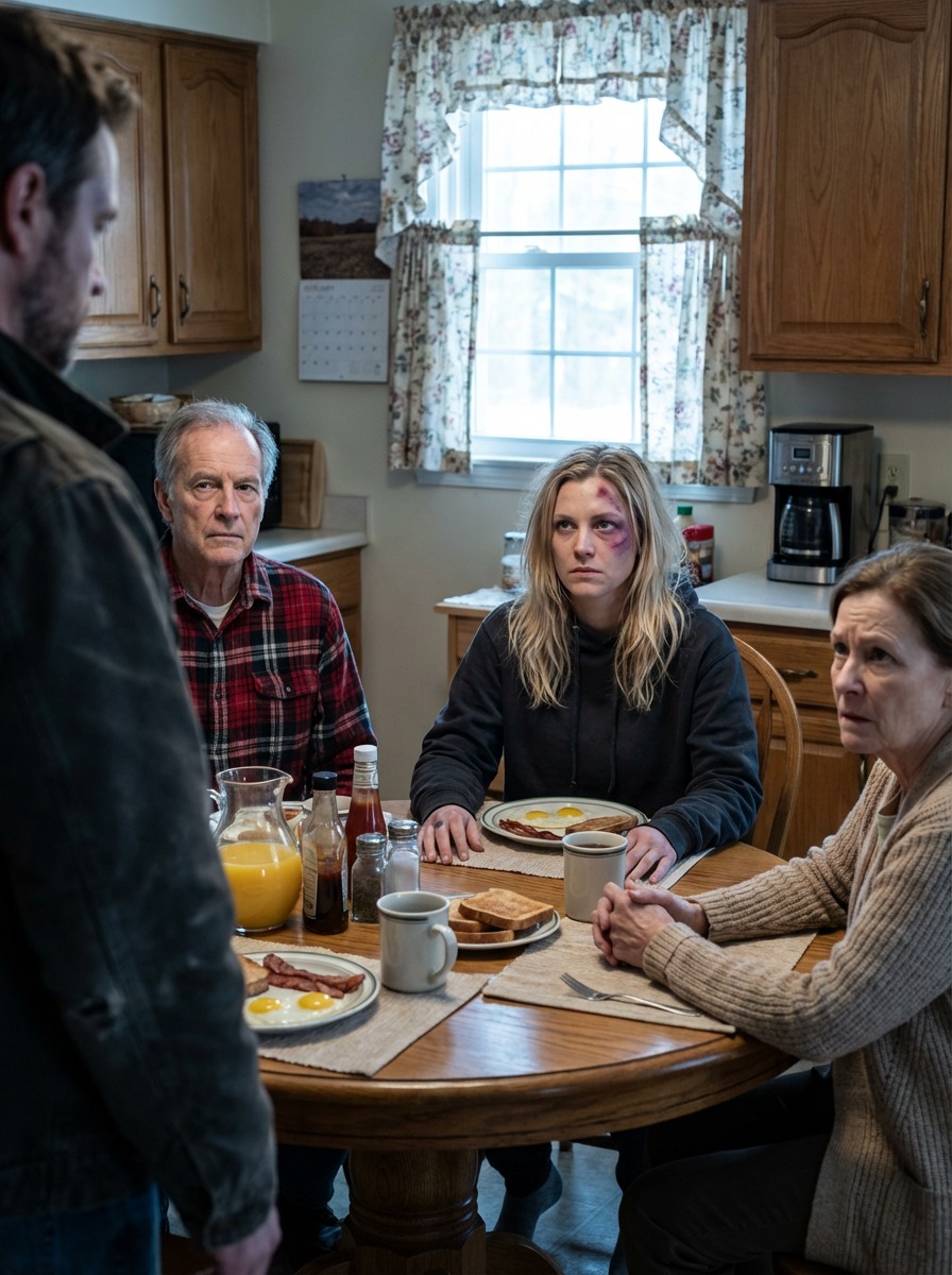 Después de golpearme, mi esposo bajó a desayunar como si nada hubiera pasado… hasta que vio quién lo esperaba en mi mesa.